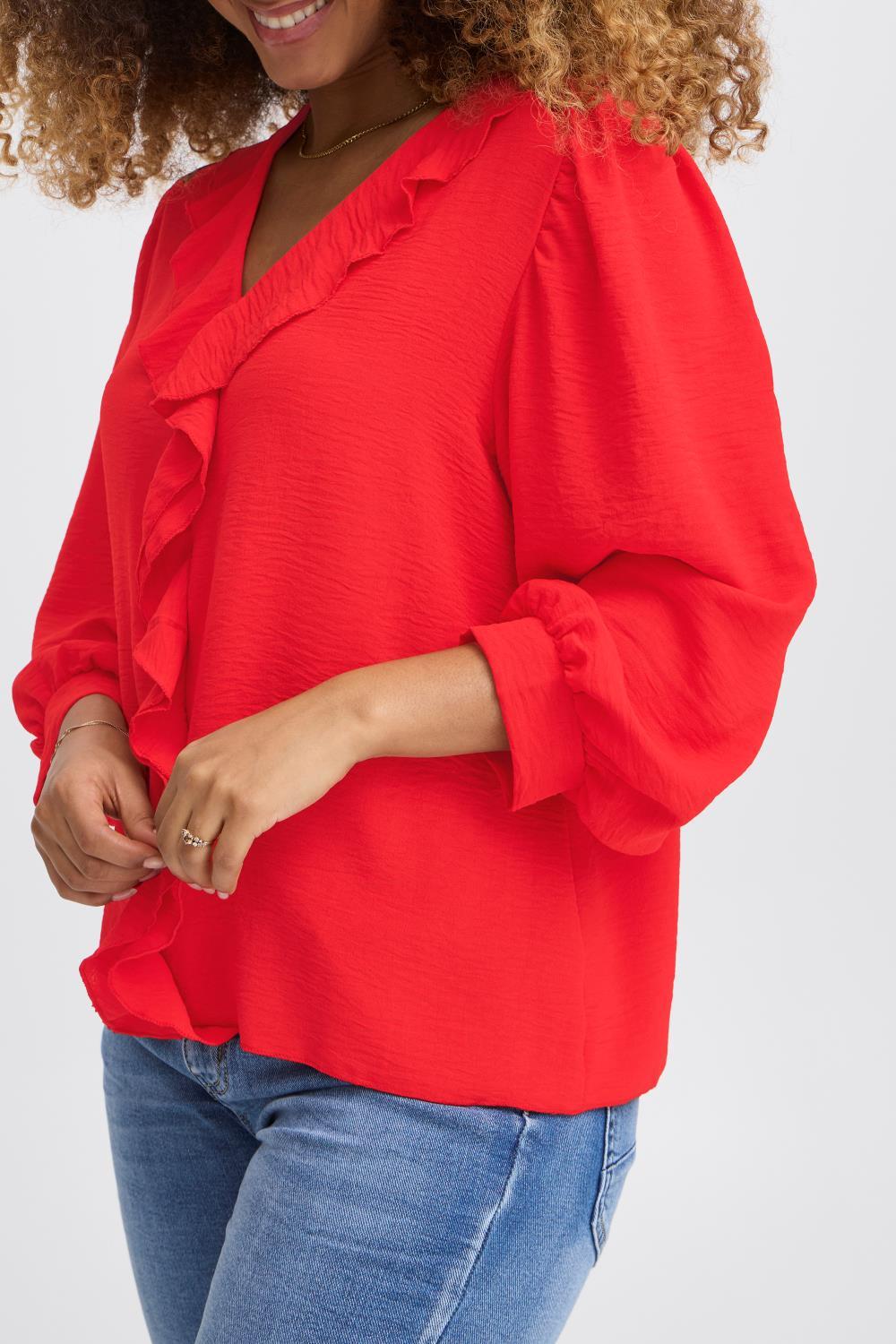 Nydelig bluse fra Sorbet. Blusen har lange ballongermer, rett passform, og nydelige volangdetaljer på brystet og i kragen.