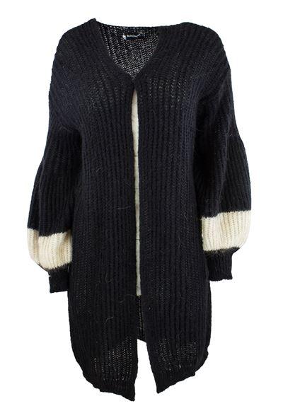 Lett og nydelig cardigan fra Boheme i fine høstfarger. Denne jakken er lang, har rett passform, ballongermer og en hvit stripe omtrent nederst på ermet.