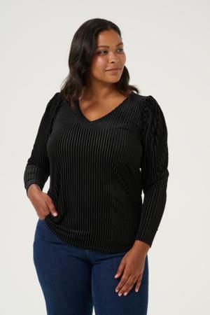 Elegant topp fra Kaffe. Denne toppen har rett passform, V-hals, og lange ermer med puff i skuldrene. Den er perfekt til enhver spesiell annledning.