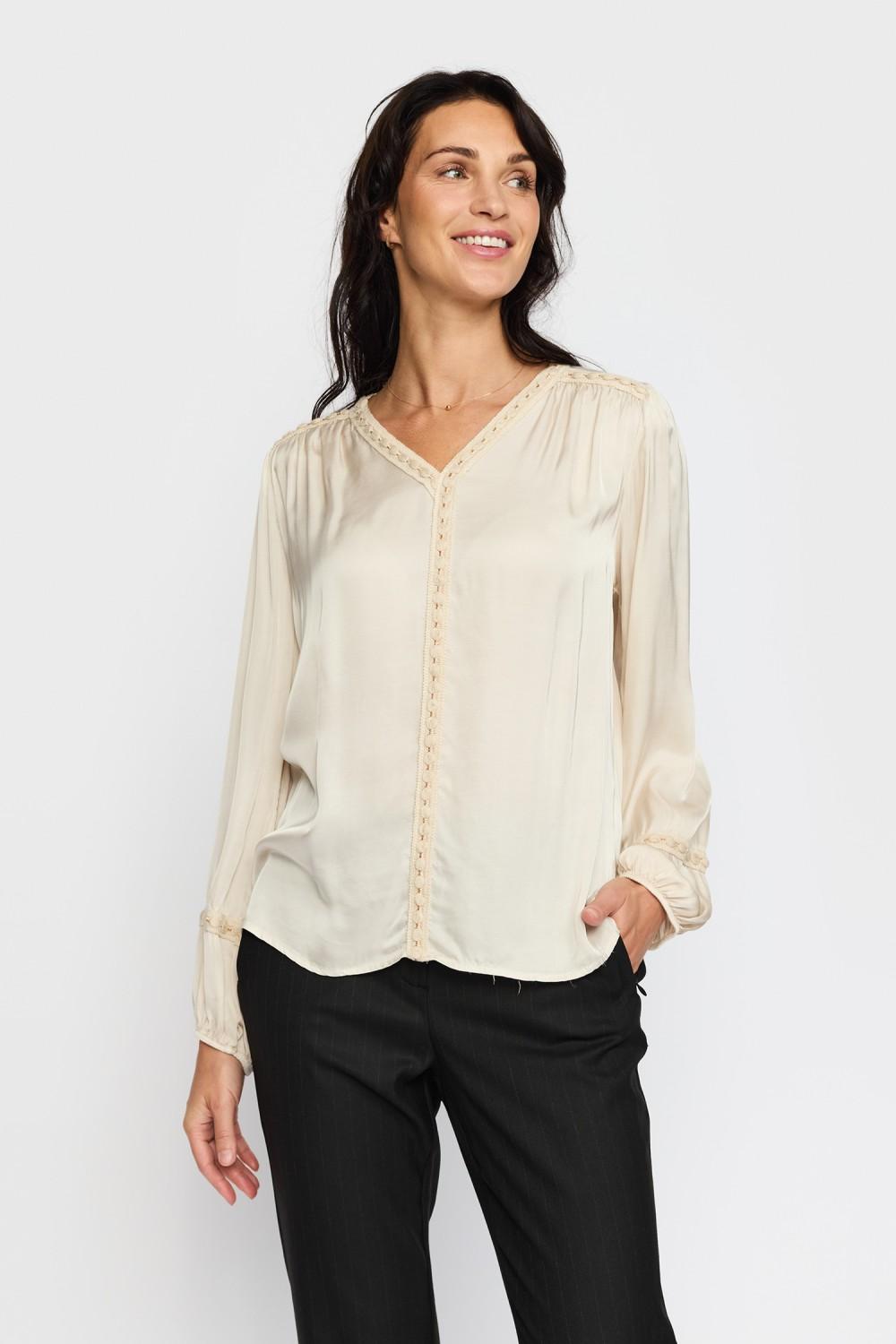 Denne fine blusa fra 2Biz passer til alt fra hverdag til fest. Den har V-hals, lange ermer og nydelige glitterdetaljer rundt kragen, på ermene, og ned foran. Blusa er utrolig lett og komfortabel å gå i.