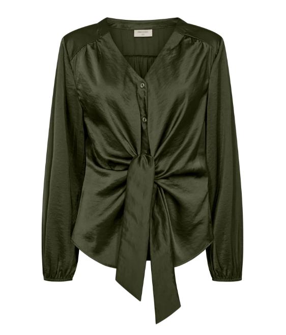 Nydelig bluse fra Freequent. Den har lange ermer, V-hals med knapper, og knutedetalj foran. Blusa er i sateng og er perfekt til enhver anledning.