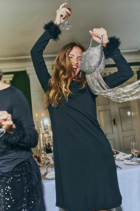 Utrolig vakker kjole fra Freequent. Den har rett passform, rund hals, og lange ermer med fuskepels nederst. Kjolen er perfekt til vinterens mange selskaper, og kan styles til f.eks. høye heler eller boots.