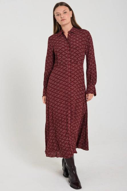 Nydelig kjole fra Freequent. Den har lange ermer, skjortekrage, og rekker til midt på leggene. Kjolen er luftig og lett, og har lomme på begge sider.