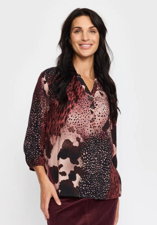 Nydelig bluse fra 2Biz. Den har V-hals med knapper, 3/4-ermer, og et nydelig mønster. Blusa er utrolig lett på kroppen, og veldig god å gå i.