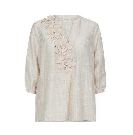 Elegant bluse fra Freequent. Den har rett passform, 3/4-ermer, og nydelige blomsterdetaljer ved kragen. Blusen er lett og god i stoffet, og kan brukes til en rekke anledninger.