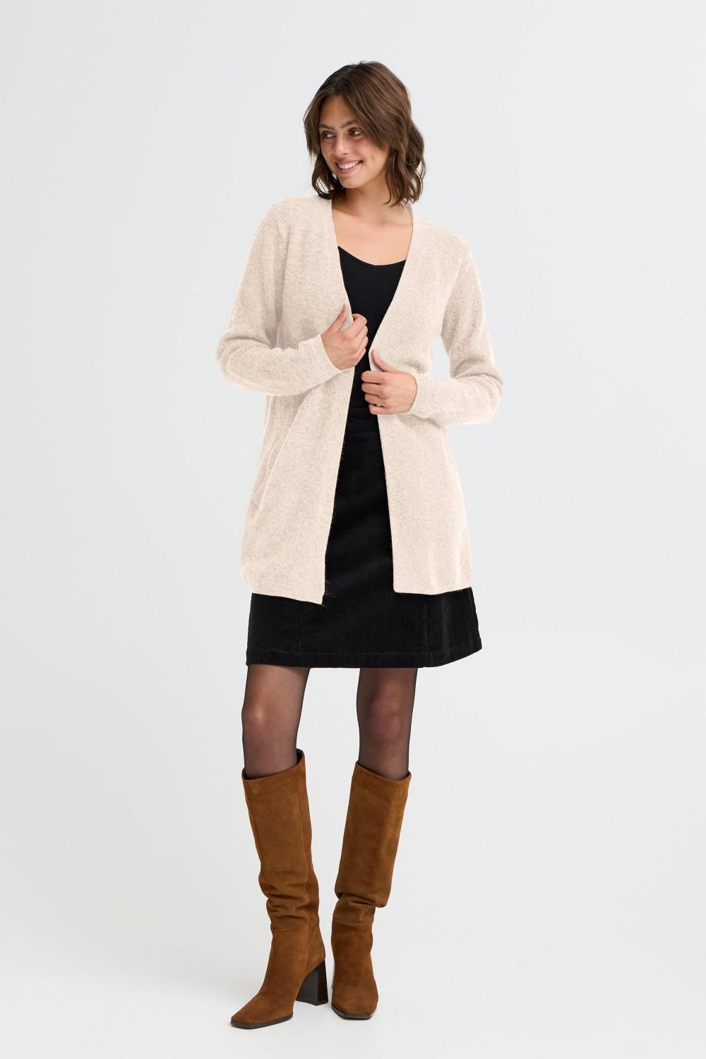 Denne nydelige cardiganen fra Fransa er perfekt til høstens kjøligere dager. Den har lange ermer, vid fasong, og rekker omtrent til knærne. Cardiganen har også lommer på hver side.