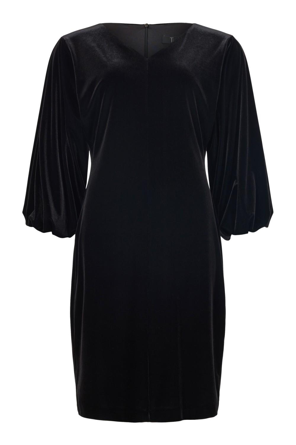 Elegant kjole fra Tia. Den har V-hals, A-fasong, og 7/8 ballongermer. Kjolen er i velour, har glidelås bak, og passer perfekt til selskap eller andre festligheter.