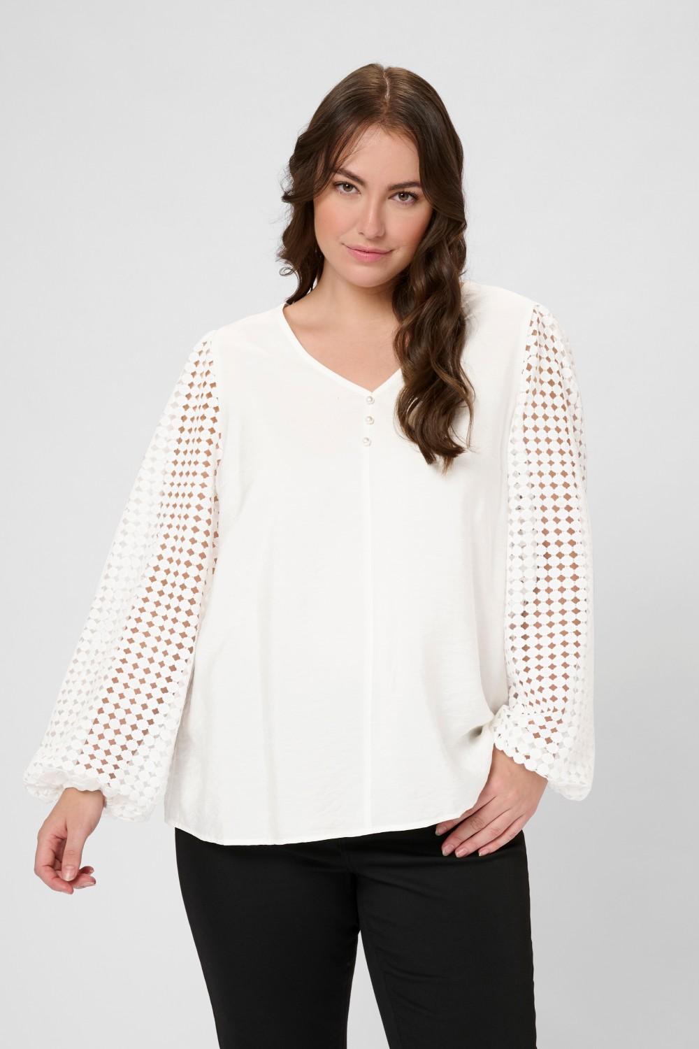 Fin bluse fra Kaffe Curve. Den har V-hals med perler, rett passform, og lange ermer i blonder. Blusen er utrolig god og lett å gå med, og passer til både selskap og hverdag.
