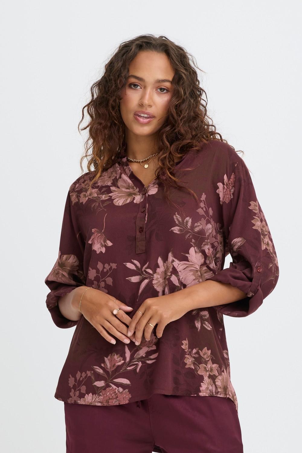 Vakker bluse fra Sorbet. Den har vid passform, V-hals med knapepr, og 7/8-ermer som kan kneppes opp. Blusa er lett og myk, og utrolig god å gå med.
